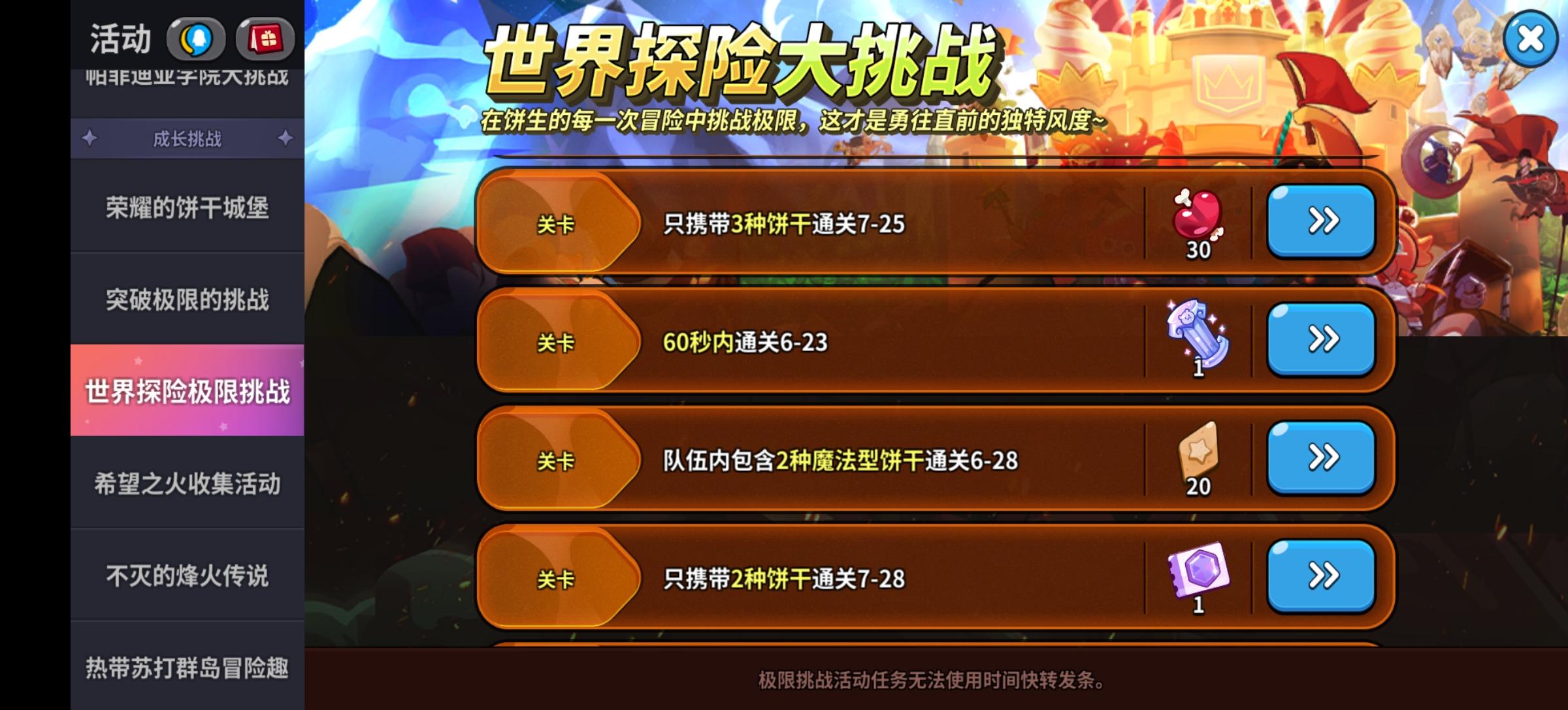 这里说的一种不是指爆炸或者防御一类饼干,而是一个!还有!这个活动所有挑战都不能用加速齿轮!!用了不计入活动,也就是相当于没完成挑战,打的时候注意!