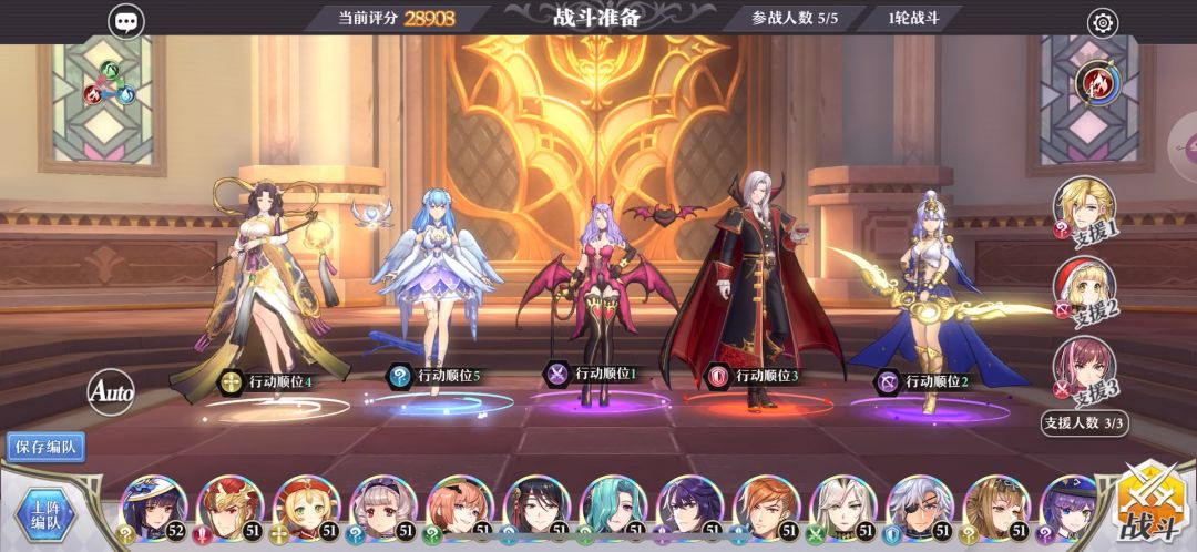 阵容上,我选择暗弓,嫦娥,德古拉,莉莉丝,梅林。【目前暗弓还没培养成型,所以伤害偏低】这个阵容把瓦妹替换下来,增加一个输出位保证打出更高伤害。首先对面有一个失误,开局莉莉丝没有单点灯,但是影响不大,因为莉莉丝点掉灯以后,嫦娥还可以再召一个灯,同样可以限制莉莉丝2回合的行动。整体思路上,主要是利用暗弓S-的速度先手控制住对面一个输出。配合天赋直接点杀对面的输出【这里射手图书馆没太刷,暗弓装备还没