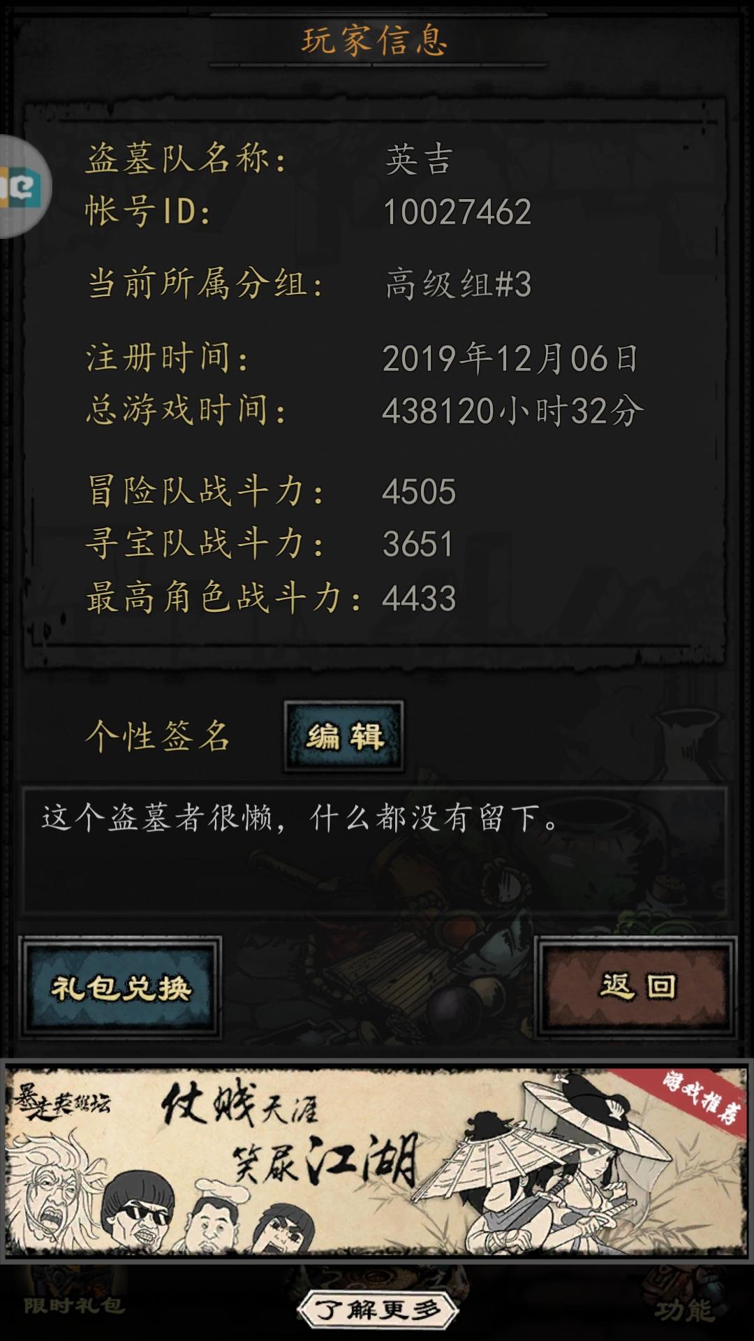 我就重新登一下,死活上不去退了了200次就是上不去。你游乱分组也就算了,我不寻宝不行么,能不能加个墓里每层清理全部怪结算经验加成10%,哪怕5%也行啊。这50-60级是要肝死人的吗?我一个1万出头的分大师组1,2星寻宝的都是13万战力的大佬,特么不如人家一个零头怎么耍?
