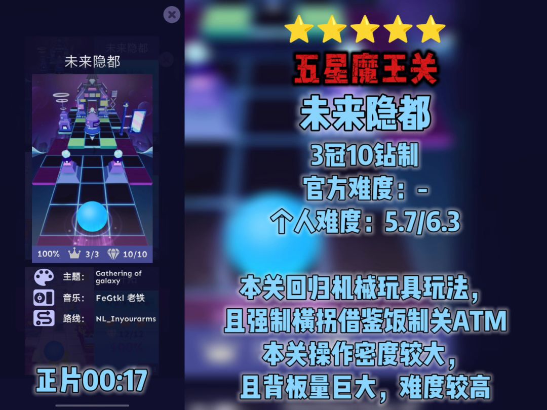 #滚动的天空 未来隐都完美通关,孩子们你们好啊,喜欢我的强制横拐和背板吗? 我都忘了这是米麦的第几个创关了,感觉像是夜光螈舞曲的demo版,几乎全是移动地板 ,这个关也算是给共创关回口血了,质量看着挺高的,只是难度…(难评)