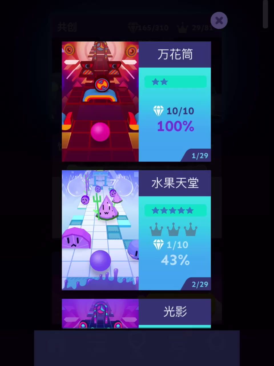你可知道,万花筒里的世界是什么样的? 关卡信息: 万花筒 kaleidoscope 星级:二星 收集物:十钻 解锁方式:默认解锁 关卡排序:万花筒-水果天堂 #游戏攻略