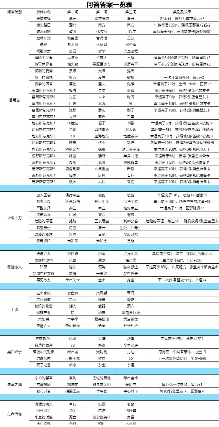 由于这条故事线所需属性面板比较高,建议开局性格深刻,宿敌多往需要的属性上面靠一、完美结局-金币国王(含1失败结局)结局奖励王族权杖,图放评论区。二、完美结局-伟大之躯(含1残局,3失败结局)开局不做家族线奖励技能光明棘轮三、支线残缺结局-政治。。跟着第二条结局线走会出现。(感觉是声望够了就会出现)文字有点敏感,在66+年,要求王族5,奖励是技能-唯一律四、完美结局-永恒统治(含4