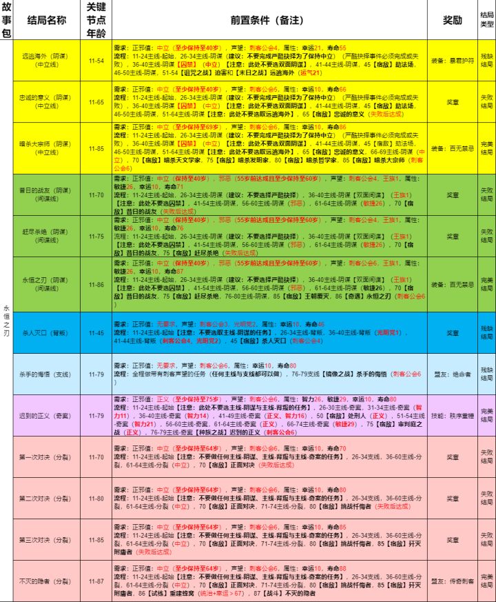 本贴包括永恒之刃包括失败结局在内共10个结局流程攻略及要点解析,完成故事线没有强制天赋要求,部分资料来源官方群群友。如有需要请结合结合使用。结局图表如下:一、完美结局-暗杀大宗师(阴谋-中立线)需求:正邪值:中立(至少保持至69岁),声望:刺客公会6,属性:幸运10,寿命86流程:11-24主线-起始,26-34主线-阴谋(建议:不要完成严酷抉择为了保持中立)(严酷抉择事件必须完成或