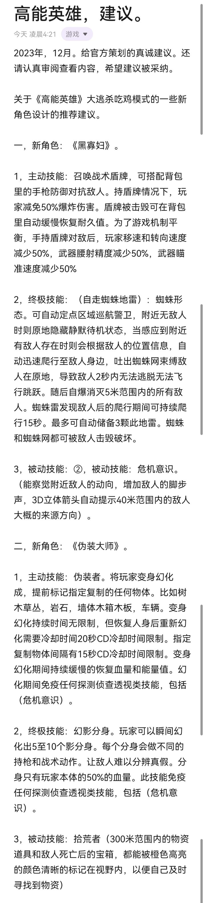 2023年,12月。给官方策划的真诚建议。还请认真审阅查看内容,希望建议被采纳。关于《高能英雄》大逃杀吃鸡模式的一些新角色设计的推荐建议。一,新角色:《黑寡妇》。1,主动技能:召唤战术盾牌,可搭配背包里的手枪防御对抗敌人。持盾牌情况下,玩家减免50%爆炸伤害。盾牌被击毁可在背包里自动缓慢恢复耐久值。为了游戏机制平衡,手持盾牌对敌后,玩家移速和转向速度减少50%,武器腰**度减少50%,武器瞄