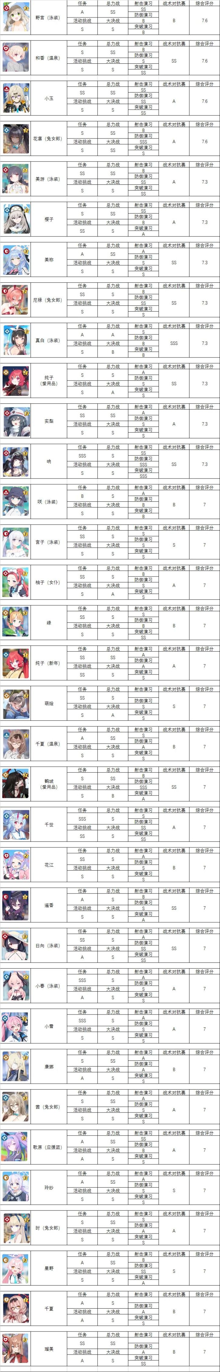 首先,转载自B站up[叫我洛神就好了]本人只是无情的搬运工正片23.8.6新加入角色:花子(泳装)、忧(泳装)、日向(泳装)、小春(泳装)至此,榜单总有151位角色与之前的榜单相比,本榜单框架进行了大幅度的调整和细分,强度(节奏)榜单包括总力战、大决战、战术对抗赛、三演习、任务、活动挑战和综合评分榜单的各个部分也是一个综合的强度和节奏评价,所以大家需要在各个部分内根据具体的场合和环境选