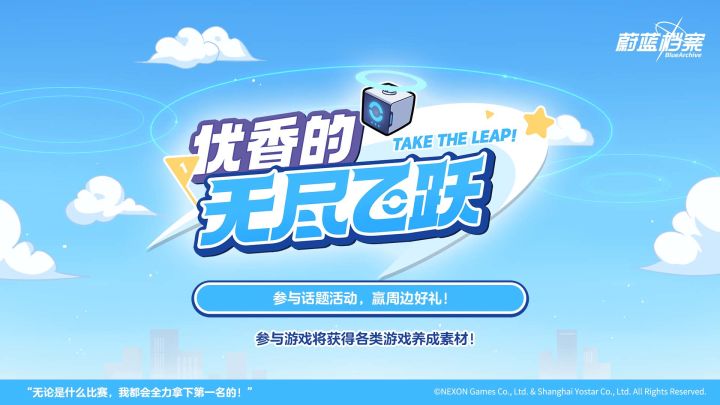 老师,限时网页活动《优香的无尽飞跃》已经开启了哦!请老师陪伴优香同学,在无尽飞跃比赛中拿下更高的分数吧!每日参与网页小游戏,还可获得各类游戏养成素材奖励!请老师在网页小游戏内截图,分享老师陪伴优香同学参加无尽飞跃比赛的截图吧!本次网页小游戏还设有【比赛成就】界面,点击可以看到老师帮助优香达成了很多辉煌时刻~这些辉煌时刻是怎么达成的呢?也欢迎各位老师在评论区分享一下心得哦~2024年08月