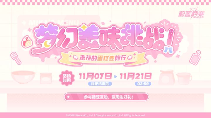 老师,限时网页活动【梦幻美味挑战!未花的蛋糕卷修行!】已经开启了哦!活动期间游玩小游戏,即可获得青辉石、信用积分、熟练证书及各类养成素材!在本次小游戏中,老师每日会随机获得一个可以制作出特殊图鉴蛋糕卷的配方,欢迎老师在评论区分享,解锁全部特殊图鉴,获得额外奖励吧!2024年11月07日 至 2024年11月20日23:59活动期间,在本帖内分享老师参加【梦幻美味挑战!未花的蛋糕卷修行!】网页