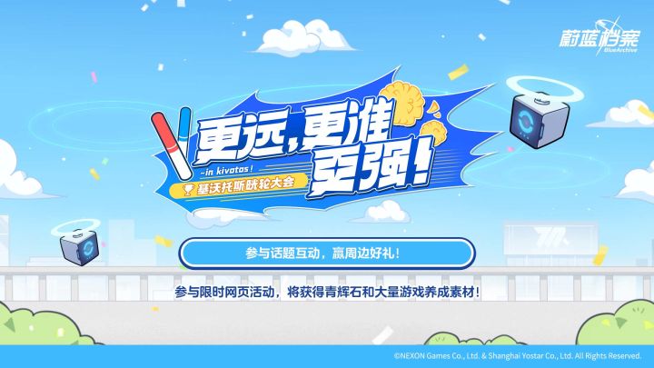 老师,限时网页活动《更远,更准,更强!~基沃托斯晄轮大会~》已经开启了哦!每日前往限时网页,完成诺亚的委托,参与修缮运动场,还可获得10次招募券×1、青辉石×300等丰富多彩的奖励!基沃托斯大运动会【晄轮大会】即将开启,为了确保运动会顺利开幕,诺亚似乎在寻找一起修缮运动场的学员。请老师推荐一下可能擅长的学员吧!2024年07月25日 至 2024年08月14日23:59活动期间,在本帖内