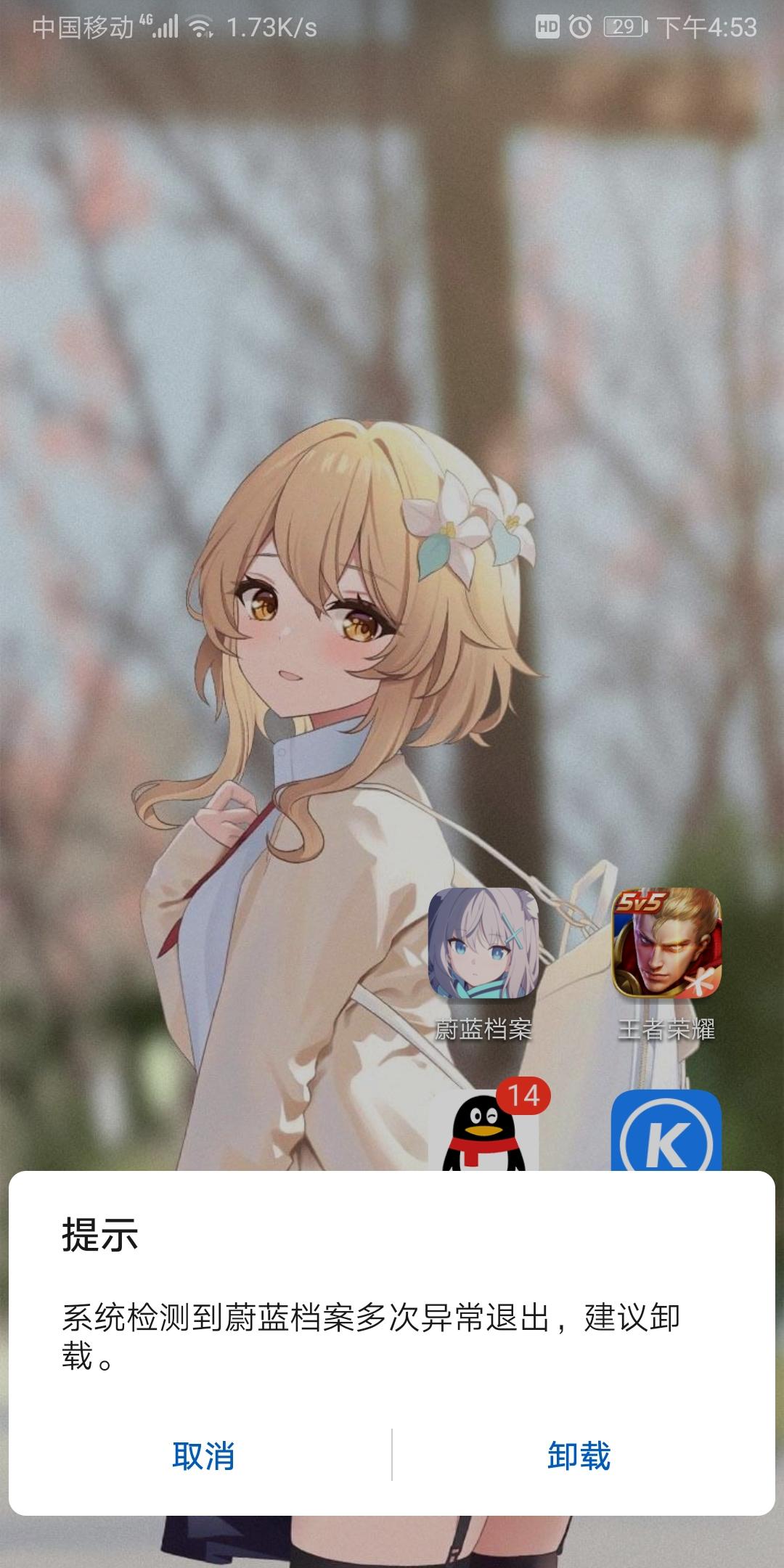 已经取就一进去就屏幕一黑,黑了几秒钟之后直接给我强行闪退出来,关机重启之后还是这个样子,有跟我一样的吗?怎么解决啊?#蔚蓝档案开服打卡