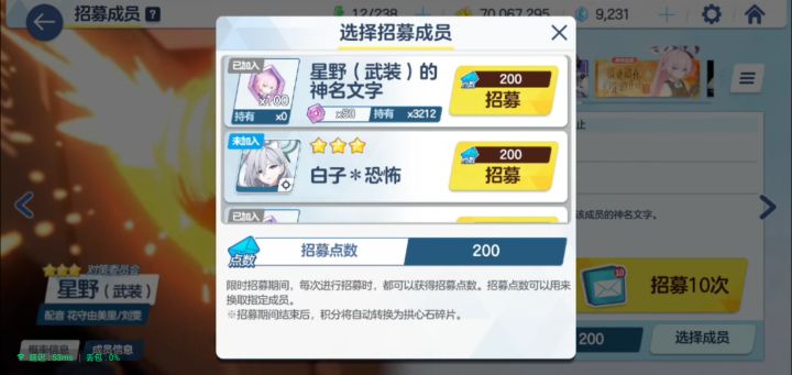 最开始第一个黑子池子,第一发十连出了星野,然后第二发十连是黑子然后就上头一直抽到200,中间出了好多,我有的和我没有彩,190的时候就只出了第二只黑子,然后我不甘心一直下了两井,今晚现在还剩3w,虽然抽爽了,但是我感觉当期up概率还是好低啊,后面我升级s全是用碎片换的贪了贪了#蔚蓝档案 #小鸟游星野