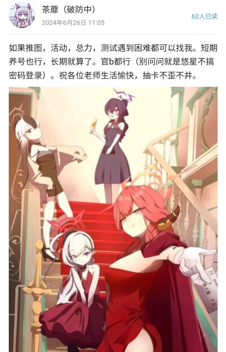 q:483491448 官服小组:48574在创这个群之前,我还加入了两个ba群,但群里基本只有低龄儿童刷屏和讨论暗区突围的,因此我就想创建这个纯净的ba群(但愿如此吧)群主没啥实力,看号啥的还是找群里其他人,但群主博览群书,星雨来了可以找我推荐ba好书,然后也会发点美图和二创(当然不是我做)