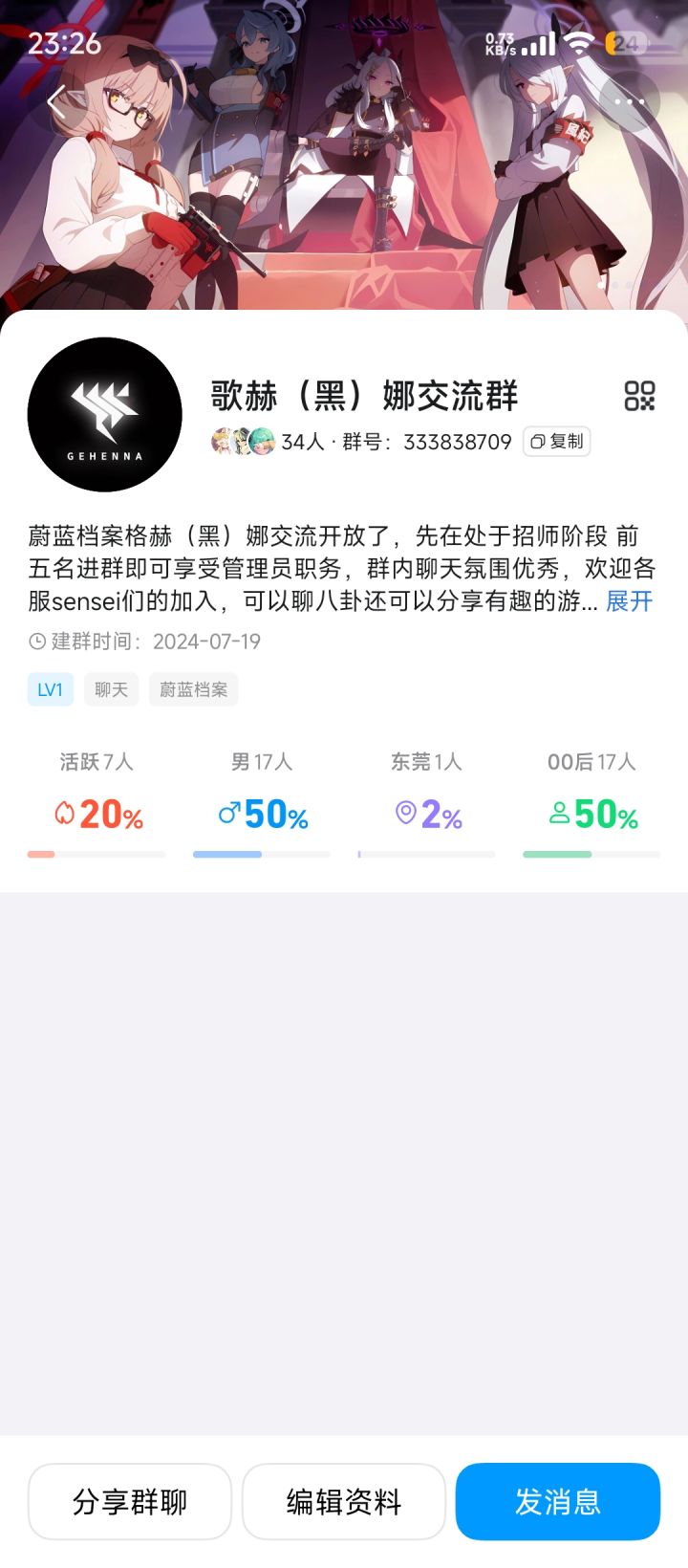 #蔚蓝档案 群聊招人了,本群聊天环境不错群友相处融洽,本群管理位不多,进群可聊八卦分享游戏日常或生活日常欢迎全服蔚蓝档案玩家,支持多服交流,还想了解更多那就加群,随时欢迎各位老师的大驾光临。