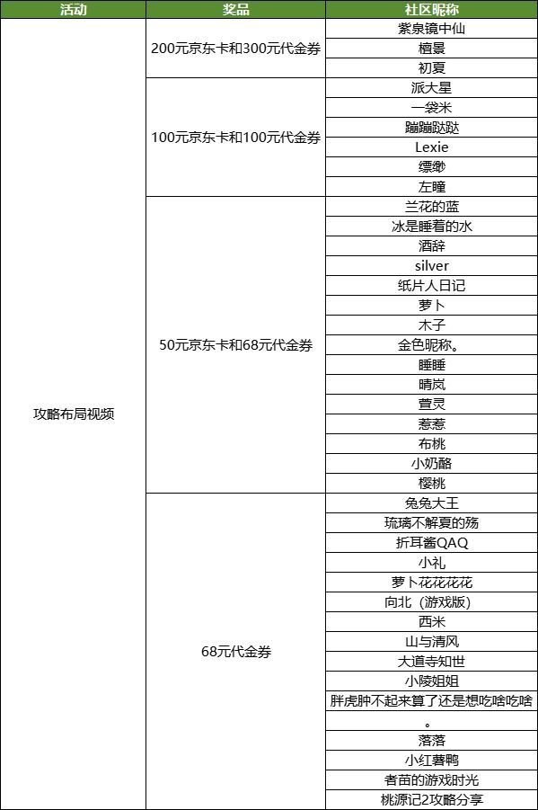 恭喜以下谷主获奖,请获奖的谷主在七个工作日内添加工作人员QQ:3847635744,备注攻略布局视频领奖,提供帖子截图、主页截图和游戏玩家编号领奖,逾期视为放弃领奖资格。《桃源记2》已在全平台首发上线,还未下载的谷主快前往下载游戏吧!游戏刚正式上线,想必许多初体验的谷主对于游戏应该还不甚了解,急需要攻略帮助,或者需要布局来了解游戏。我们决定开启攻略布局活动,帮助谷主更好的从零开始重建家园!活