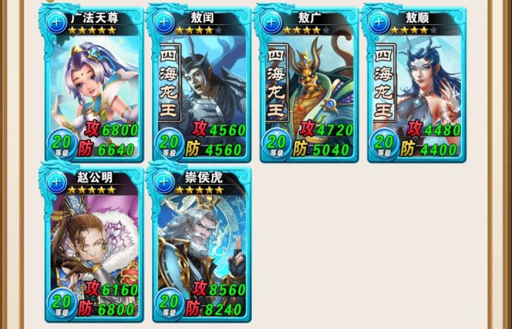 这里列举阶段性的四大流派。(不成型的飞姜子牙加道具,以及小的组合技,不列举)成型按时间顺序,是混元流,迷魂阵,飞土王,四海龙王流。按威力强大,是四海龙王流,飞土王,迷魂阵。先说最强的四海龙王流。这是终极最终流派吧,我在攒。(四海龙王用许愿池已经拿到,水王要夺宝积分,恐怕要四个月,文殊广法天尊的梦魇世界还没开放,)这个流派防御攻击都是最强,防御比擅长防御的飞土王还强,思路是水王拉四海龙