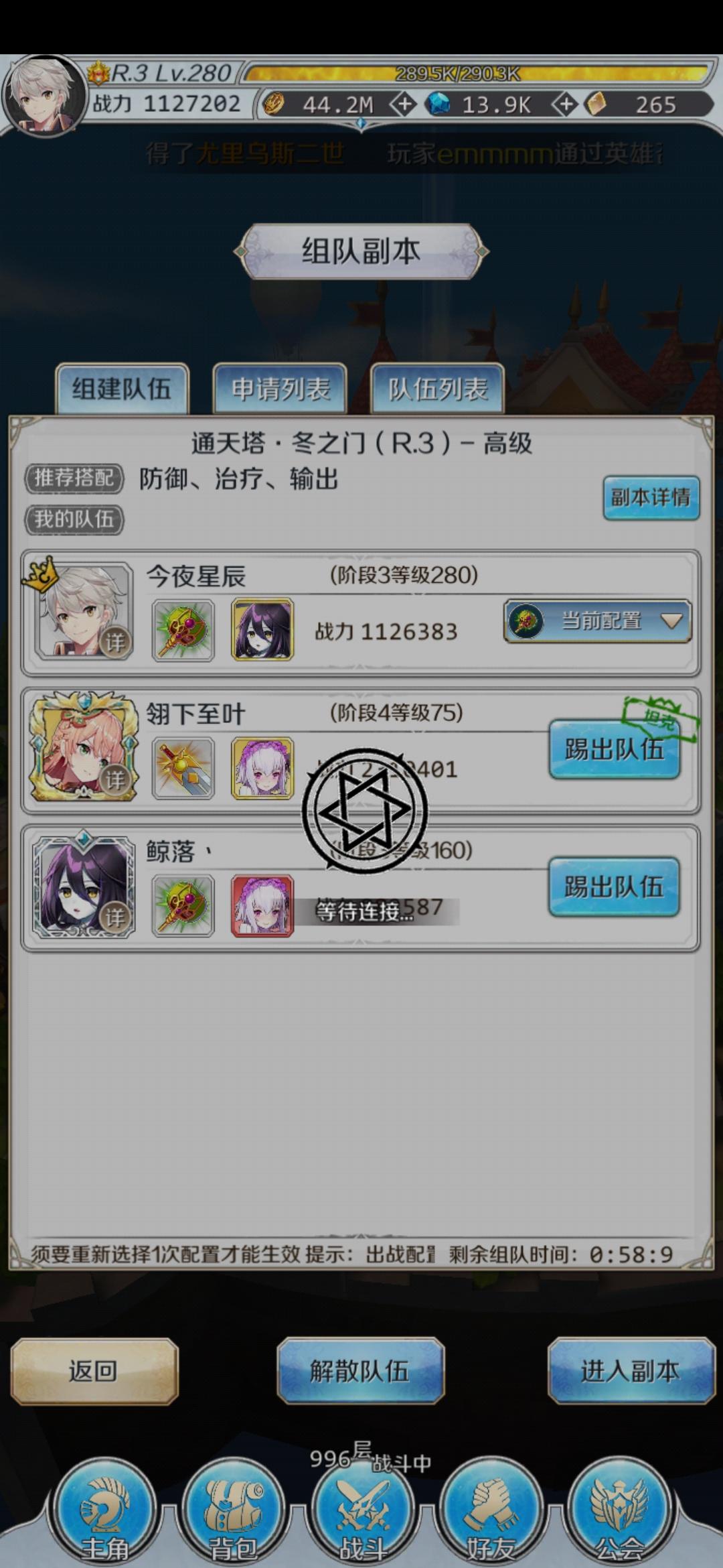 组队后就无法操作了,一直重连不能返回,不能解散队伍,不能进入副本,不能踢人,无限重连
