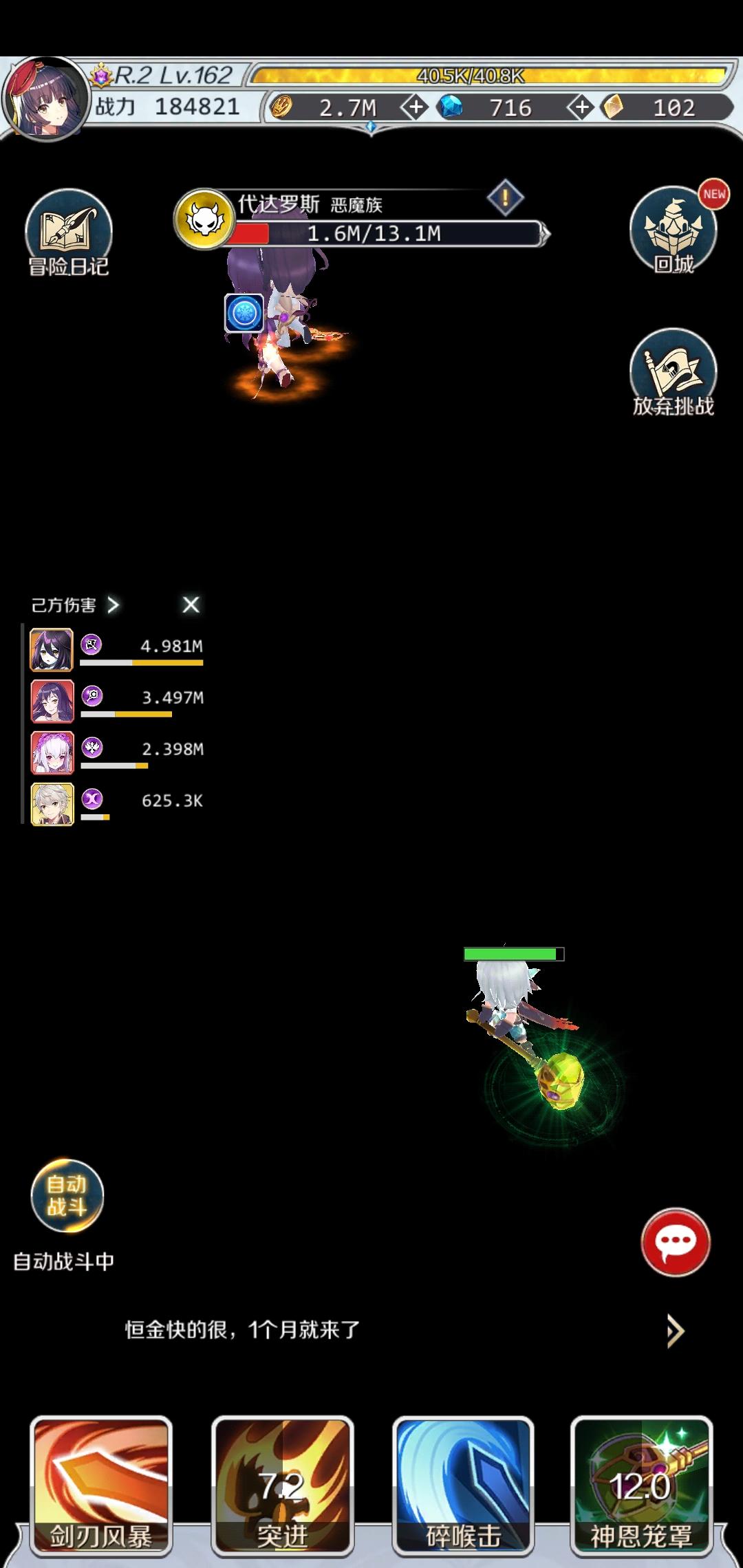 昨天才冲上R4神龙测试,自动打着打着就不自动了,连顶部挑战boss的按钮都没了。。退出重来过图,更新5连,10连过图,如果剧情层会卡,要么就跳过剧情,只能去找回放看。因为物品经常要满,会退出地图又重进,试过有一次,界面卡在加载0,但是会有战斗生效。。胜利会切换界面。然后又卡在加载0。。。只能大退