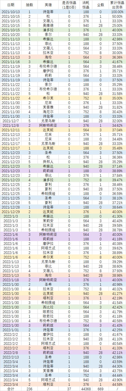 2021.10.13在群友奶茶的诱惑下,抽了公测的第一发大锅2021.10.15菜菜发了1188恒晶补偿,打算去祸祸了,结果直接保底,教我做人2021.10.20上了R3 800层,抽个大锅庆祝一下~好开心哦,又到手28尘2021.11.13恒晶超过5000,手痒,祸祸了一波大锅,依旧黑的一批不过还好出的是2个贤者,稍微有点安慰了。2021.11.16灵感来了,抽一发,出了个希露达,好耶~