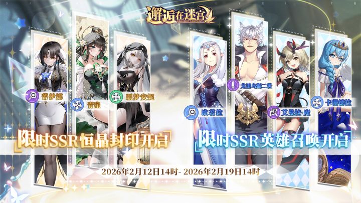 亲爱的冒险者,本期恒晶封印及英雄召唤预告如下。 卡池开启时间:2026年2月12日14:00 - 2026年2月19日14:00本期限时SSR恒晶封印开启英雄:青崖、海伦、帕纳索斯限时恒晶封印记录解封进度与次数,完全解封上限为10次。本期限时SSR英雄召唤开启英雄:摩伊拉、阿塔兰忒卡池开启期间,限时召唤英雄概率提升,具体如下:限时SSR英雄:1.40%其他SSR英雄:2.80%SR