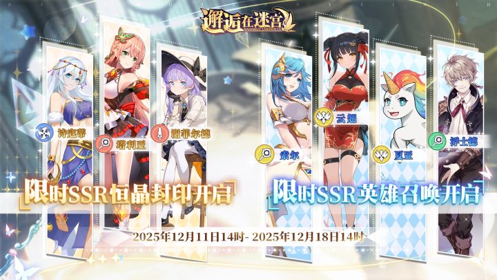 亲爱的冒险者,本期恒晶封印及英雄召唤预告如下。 卡池开启时间:2025年12月18日14:00 - 2025年12月25日14:00本期限时SSR恒晶封印开启英雄:夏洛蒂、蒂亚娜、达芙妮限时恒晶封印记录解封进度与次数,完全解封上限为10次。本期限时SSR英雄召唤开启英雄:异邦人、茉莉安卡池开启期间,限时召唤英雄概率提升,具体如下:限时SSR英雄:1.40%其他SSR英雄:2.80%S
