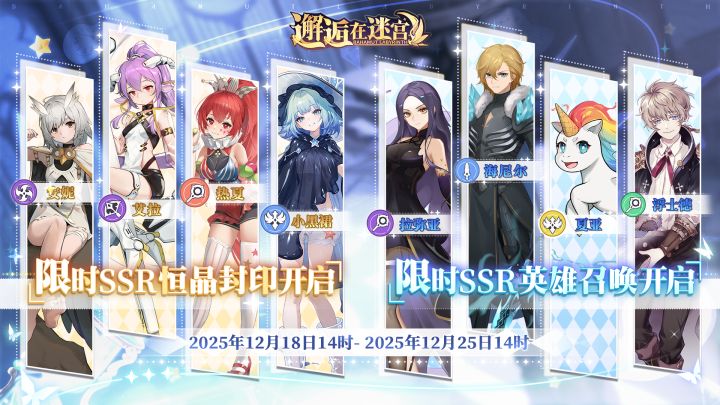 亲爱的冒险者,本期恒晶封印及英雄召唤预告如下。 卡池开启时间:2025年12月18日14:00 - 2025年12月25日14:00本期限时SSR恒晶封印开启英雄:安妮、热夏、艾拉·神限时恒晶封印记录解封进度与次数,完全解封上限为10次。本期限时SSR英雄召唤开启英雄:拉弥亚、海尼尔卡池开启期间,限时召唤英雄概率提升,具体如下:限时SSR英雄:1.40%其他SSR英雄:2.80%S
