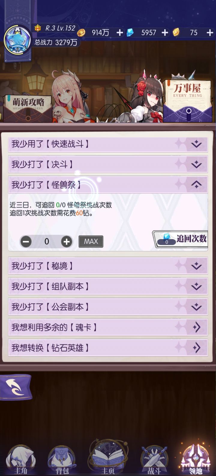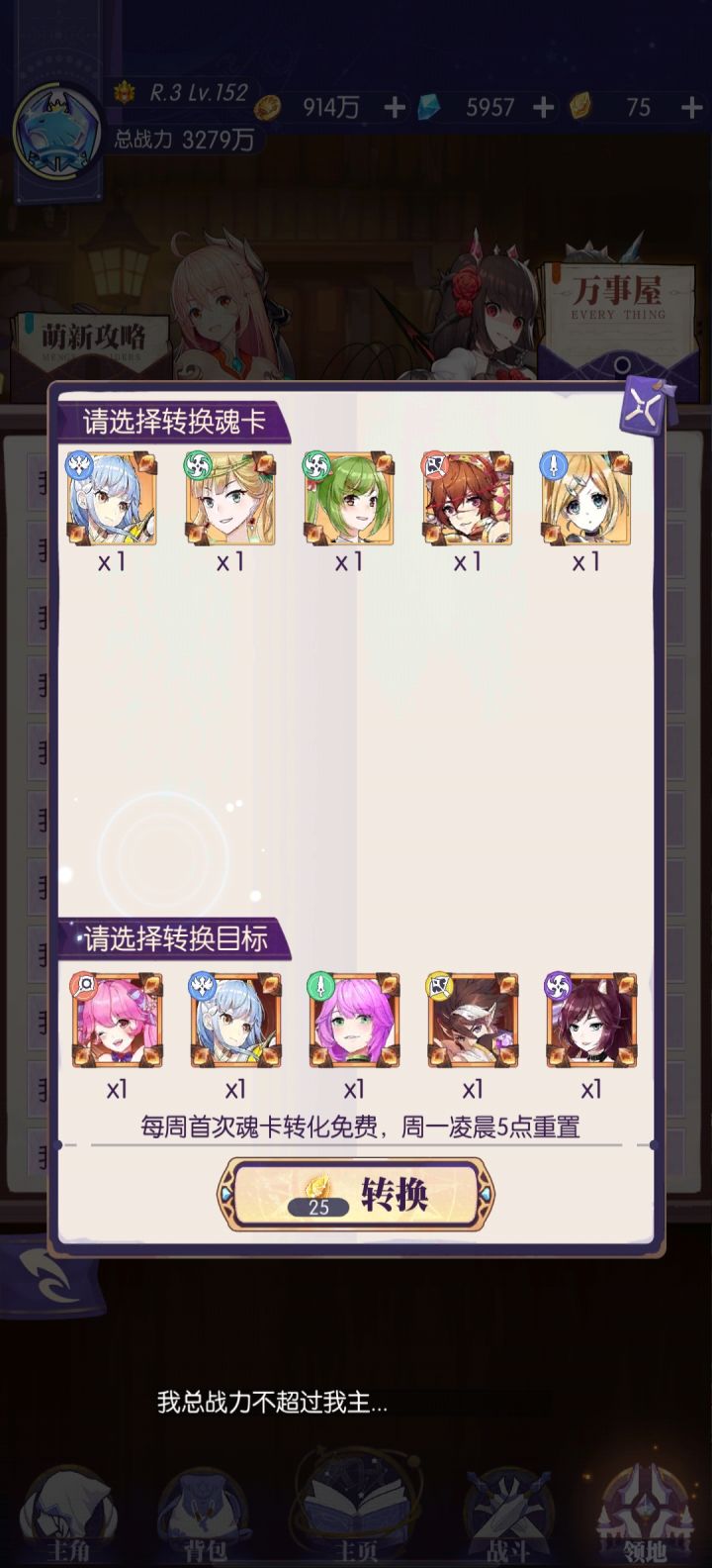 一个对新手比较有用的功能,在主城的万事屋里,有一项我想转换多余的魂卡,可以花费25恒晶转换橙色+的魂卡,很有用!每周第一次还免费,新手可以多使用这个