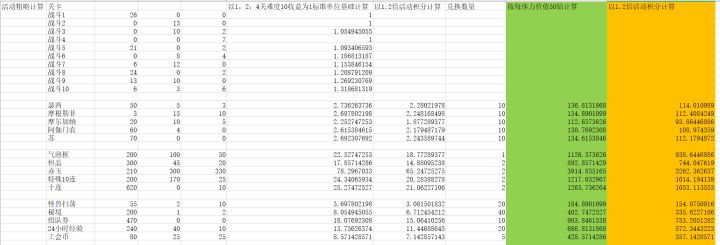 简单的统计了一下这次活动的收益。以下数据都是难度10下估算。活动第8天开始,扫荡收益比较大。活动兑换道具,风铃需求很多,所以第8天扫荡次数是最多的。兑换价值高的是恒晶,赤玉,秘境券,十连,特殊十连。价值中等的是狗粮,气泡(对收集癖来说是高价值),24h经验药水(对卡元素而不是卡经验的来说是低价值),工会币,组队券(仅新手需要完成协会任务时有价值),扫荡券(有价值,但是可换可不换,哪怕我在r4