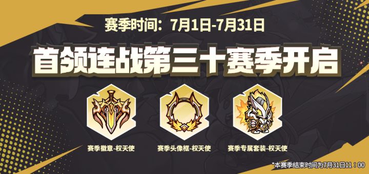亲爱的宝子们:周末大家有什么计划呢?小蓝龙也搬来了首领连战新赛季的消息,一起来看看吧~首领连战第三十赛季开启啦!本赛季首领连战挑战顺序现已更新,赛季特效套装&赛季头像框【权天使】已上架公会商店!请及时兑换喜欢的物品哦~【首领连战第三十赛季规则】1、首次通过单人模式-首领连战前10层:获得赛季徽章。2、首次通过单人模式-首领连战前15层:获得公会商店7折打折券,打折券可用于购买商店货架物品