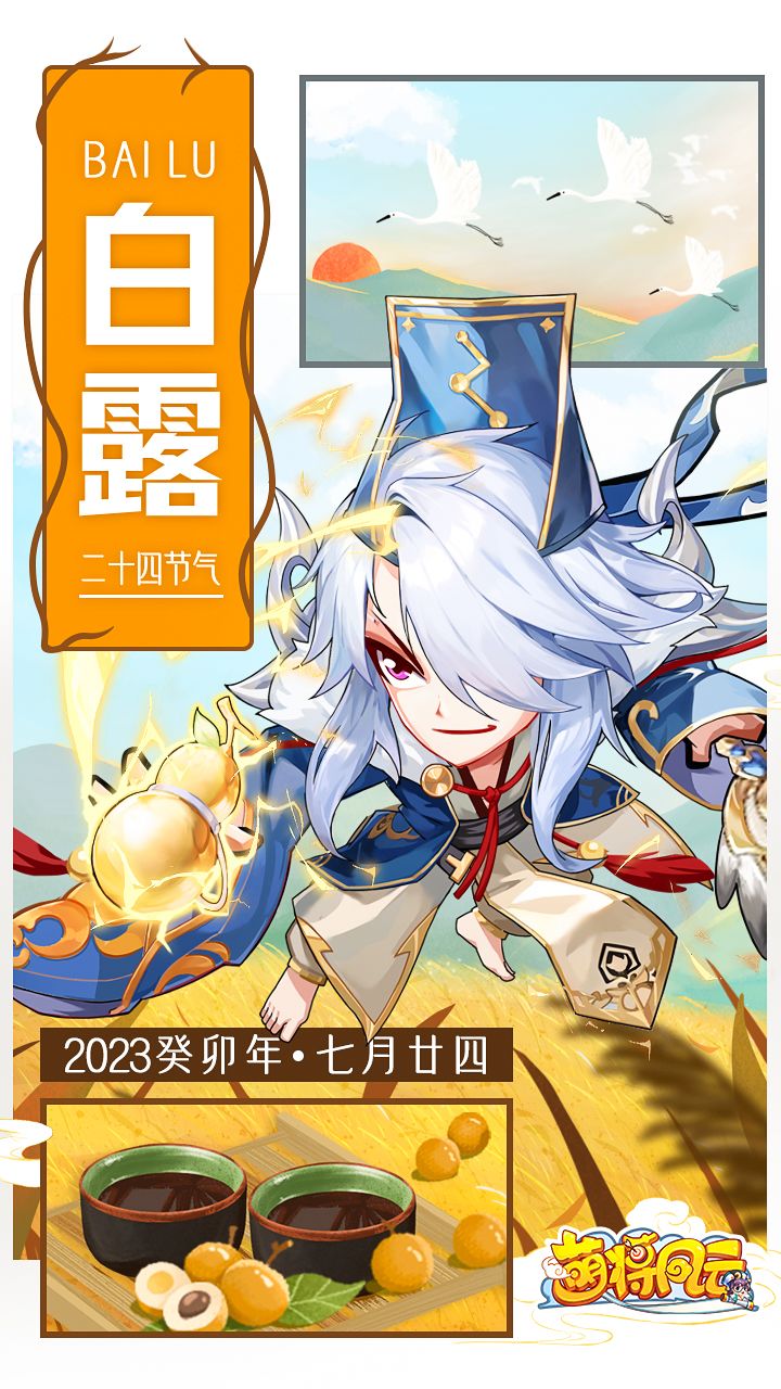 白露,是“二十四节气”中的第15个节气,秋季第3个节气,干支历申月的结束与酉月的起始。民谚云:‘白露身弗露。’言至是天气乃肃,可以授衣耳。”意在提醒人们此时白天尚热,但早晚天气已有凉意,如果打赤膊就容易着凉。此外,这个时节还需预防秋燥。 白露期间的各地民俗,主要有祭祀大禹、酿五谷酒、喝白露茶等。【节气礼包】:白露为霜【到期时间】:2023年9月17日23:00#游戏安利#游戏推荐#游戏讨论#游戏福利
