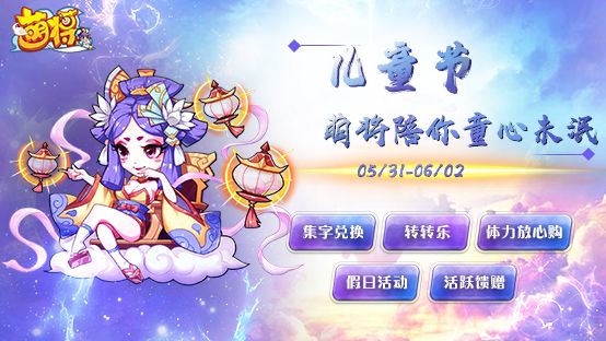 各位小主们好:童心未泯,稚趣六一!《萌将风云》为各位小主带来福利满满的六一精彩活动!拼凑稚趣的时光,“集字兑换”、“转转乐”、“体力放心购”、“假日登录”、“活跃馈赠”再度来袭。下面是六一活动的精彩内容预告:【活动一】“童心未泯”活动活动时间:5月31日~6月2日活动内容:活动期间,通过副本获得掉落的六一文字来兑换心仪的道具。活动范围:全服【活动二】“限时掉落 ”活动活动时间:5月