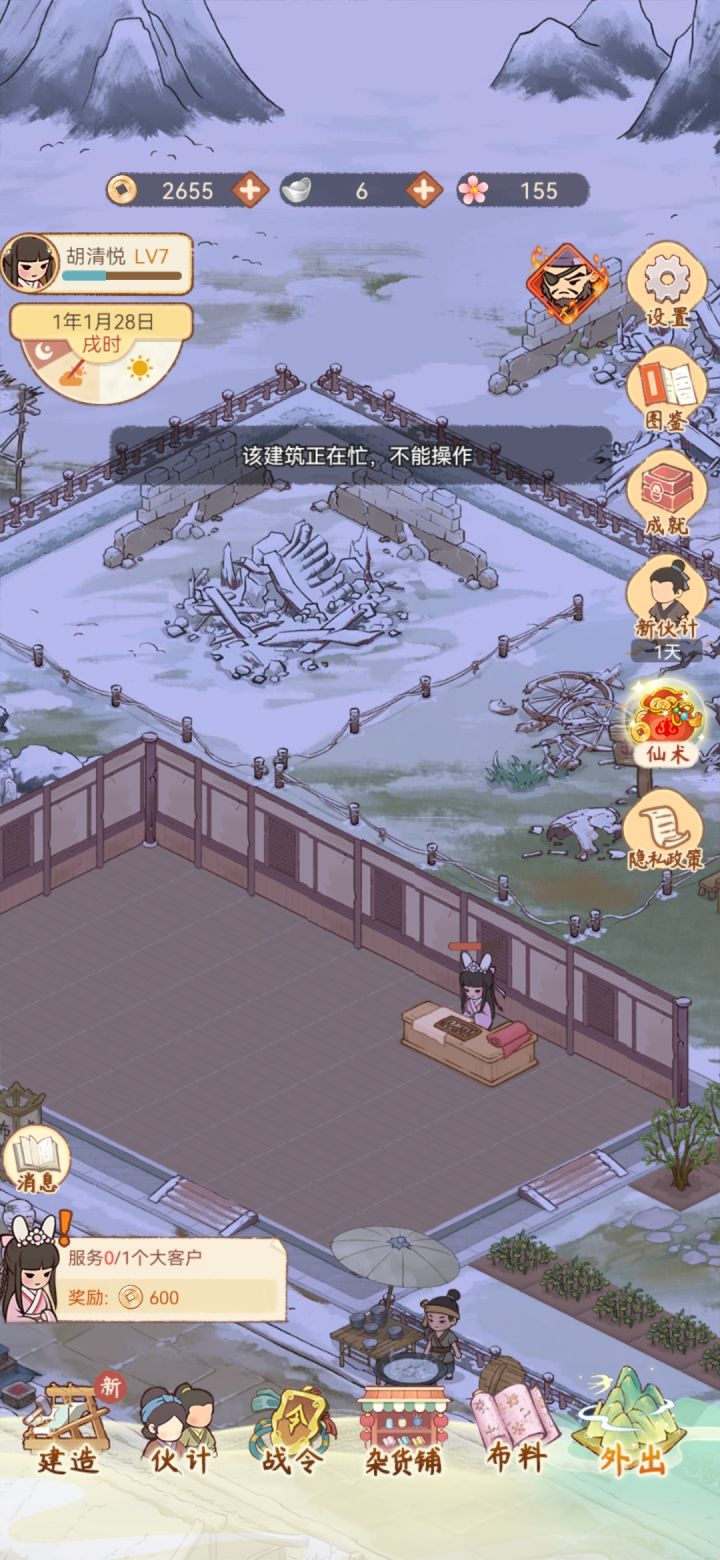 画面不错,游戏里出现的传统纺织元素也很不错。但是模拟经营游戏不能靠经营升级解锁新玩法,而要每天跑去几个固定的地图打怪刷经验升级,就挺bug的。