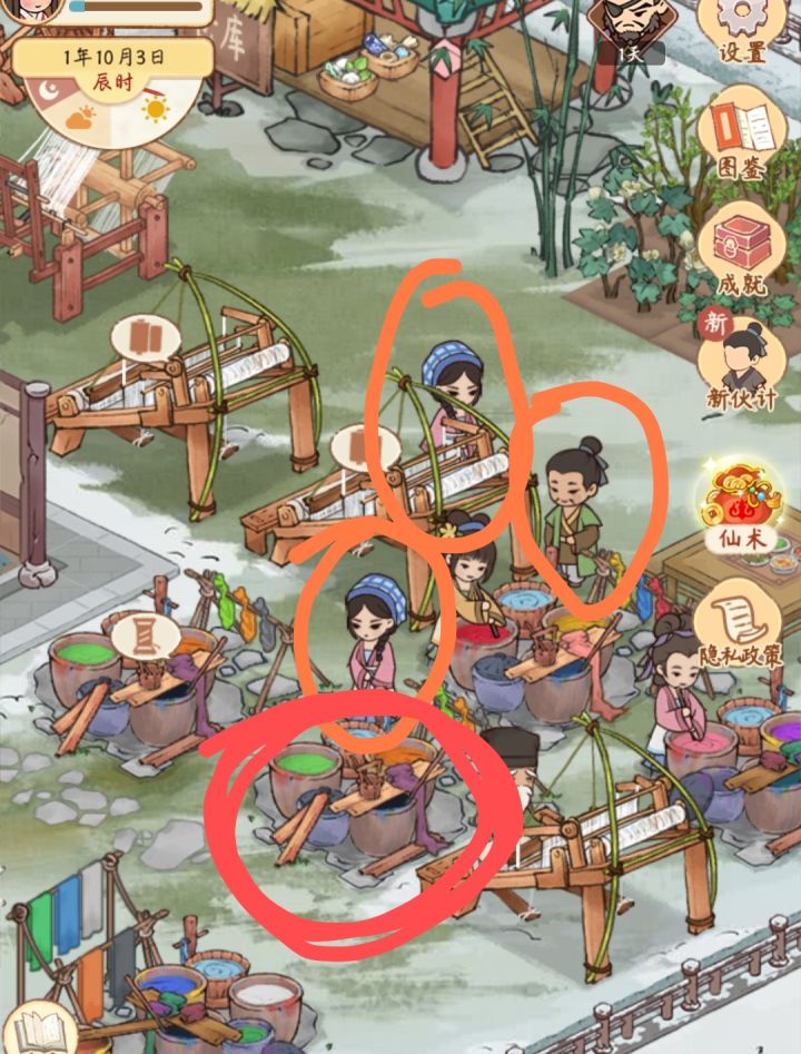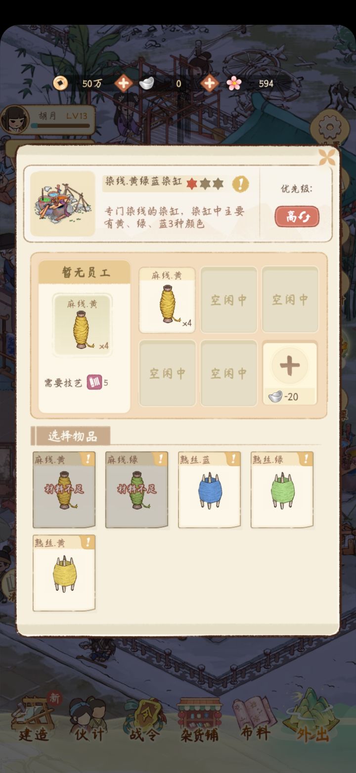 大概过了半个小时,bug自动恢复了,真奇怪。——————————————————三个员工在闲逛,就是不去染缸制作东西。测试1:把染缸收回仓库再放出来也没有用,还是这样。测试2:关游戏重开,没有用,还是这样。测试3:旁边的空纺织机和染缸正常,选择后,员工会主动去制作物品。官方还不找找这是什么情况吗?相当于这个染缸报废了!这种游戏bug要尽快解决啊!
