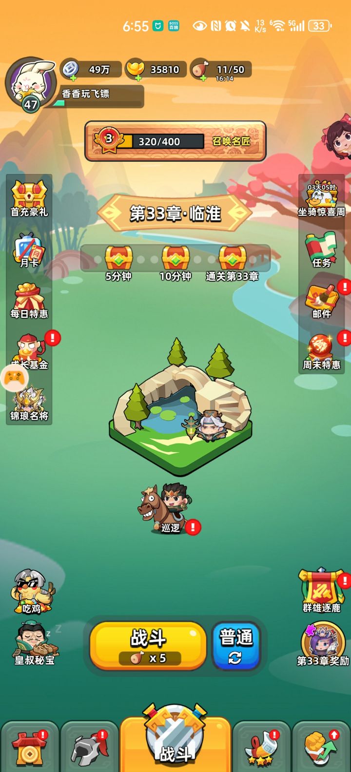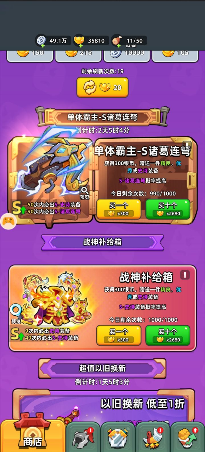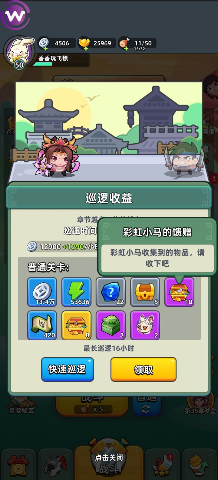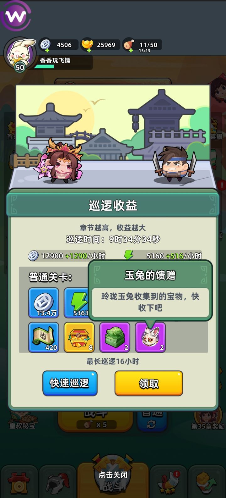 每日的资源虽然不多,但是日积月累下来也是能体现出差距的。下面是对大家日常活动及资源分配的推荐。 首先是每日商店,除了免费领取的元宝以外,非常推荐大家购买的是银币买的强化石。后期强化石比银币更加紧缺,每天的强化石推荐都买下来。 另外每天这里可以领2h巡逻银币别忘记了。 每日巡逻是要做满的,卡关以后体力溢出,不氪月卡的话巡逻次数也不够用的。 皇叔秘宝大家每天看广告嫖三个令牌就好,不要去用元宝买
