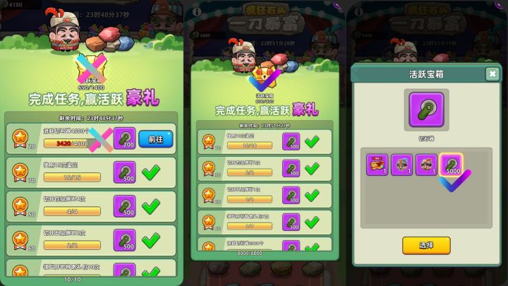 觉得有用就点个关注吧1、一刀暴富红阵首先切石器和渔网是可以积累的,红阵任务前需要积攒85300切石器可以开出一个完整红阵。任务免费切8000箱子送5000元宝可以拉1700保险起见攒够87000再切第一期活动要求1400太高了,所以第一期每天扫完只切四五级的就停手(任务要求),在最后一天看奖励再决定要不要在往下切,如果奖励低于消耗就停手!除此之外所有任务全做,买切石器赠送切石器的也要