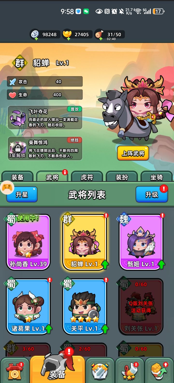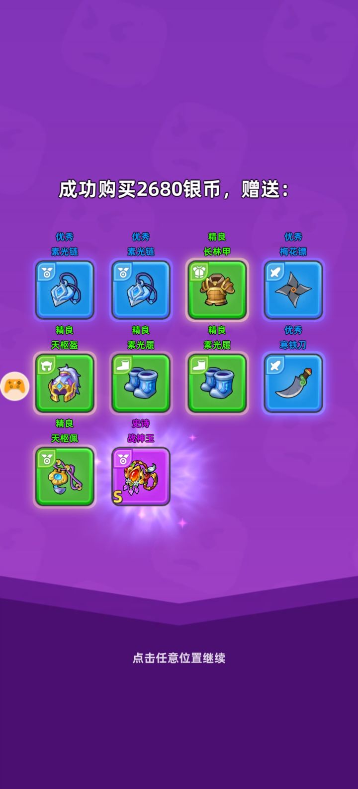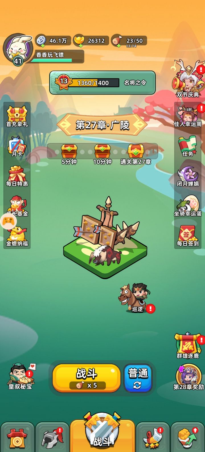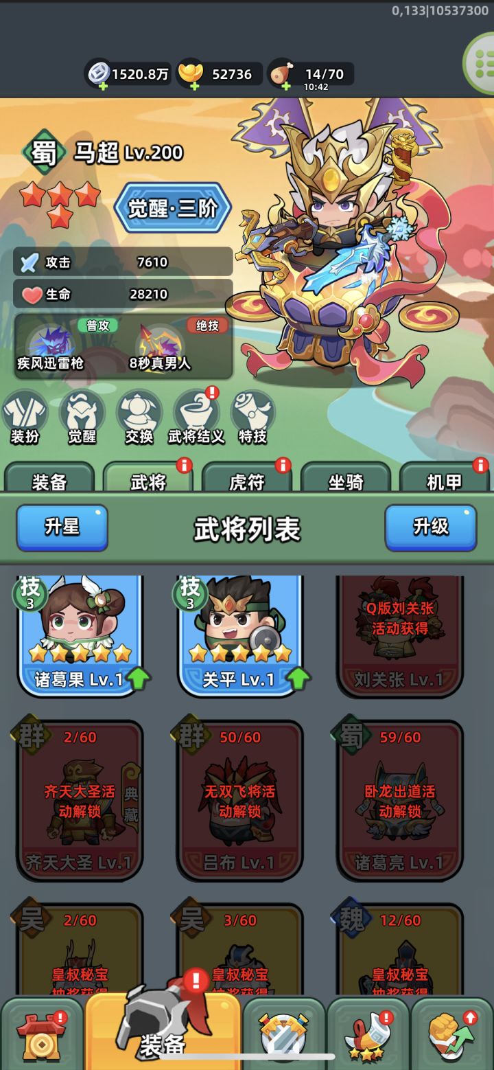 装备前期就合成战神,紫色升金色,不用担心金色不能置换的问题,后期天数够了金色也可以换,推荐天工➕连弩套,猛的一x,我现在双武器都没出来就73关了,坐骑推荐不停的抽大笨象,可惜我一直抽不出,只能用野猪过度,天赋优先点攻击力和火符,英雄推荐吕布,白板吕布也比5⭐孙尚香,5⭐貂蝉强太多,后期双武器可以带方天➕扇子刷图,单体伤害最高还是方天➕连弩。