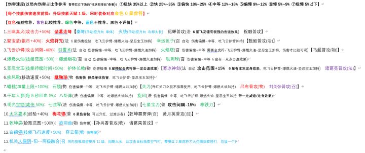 【伤害速度(以局内伤害占比作参考暂停后右下角的”柱状图按钮”查看):①极快35%以上 ②快25%~35%③偏快18%~25% ④中等12%~18% ⑤偏慢9%~12% ⑥慢5%~9% ⑦极慢5%以下】【每个技能伤害速度前提:升级技能天赋1级、同时装备对应金色0星虎符】【红色强烈推荐,紫色比较推荐,绿色中等,蓝色不推荐,黑色不评价】1.三昧真火(攻击力+50%):诸葛连弩【秦弩(手动控方向