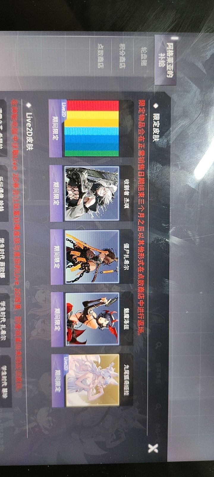 为什么阿格莱亚的补给的好多皮肤都显示异常,并且我昨天抽到了两个皮肤 一个是杰奇的收割者 另一个显示异常 去看了积分商店只有杰奇的收割者和凯茜新出的那个皮肤买不了 我想着等等更新 就没管 结果今天显示我只抽到一个皮肤,那个凯茜的皮肤又可以买了兄弟们这种情况我应该找谁啊😭😭😭好容易人品爆发