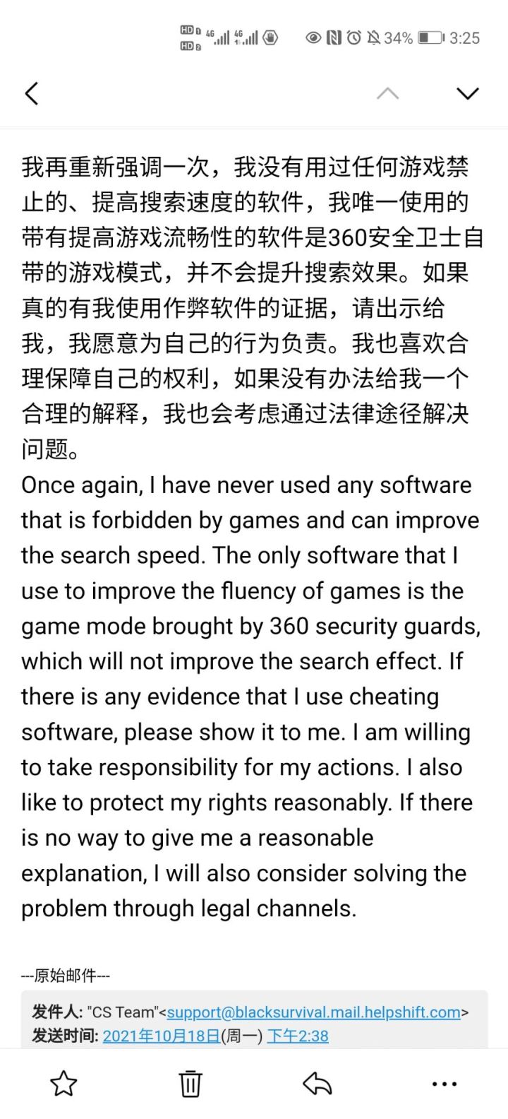 说一下之前账号封禁的事情,今天官方那边有回复邮件,说我使用了加速齿轮之类的,可以提高游戏搜索速度的软件,所以封号了,但是我再强调一遍,我电脑上的加速软件就只有360安全卫士自带的游戏模式,下面附上邮件截图,顺便问问有没有懂法律的老师,在国内起诉国外公司可以受理吗?有哪些途径呢?