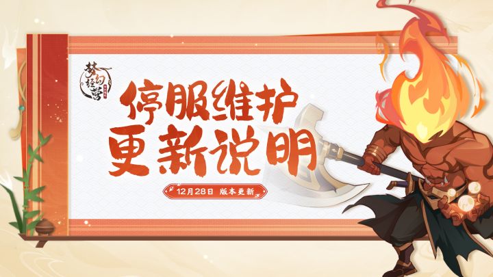 亲爱的宗主大人:为了给各位宗主带来更好的游戏体验,宗门将于2023年12月28日10点(周四)进行闭关更新。预计更新时间约为1小时,会根据实际进度提早或推迟开服时间,请各位宗主大人相互转达,并提前留意更新时间,以免造成不必要的损失。对于闭关维护期间给大家带来的不便,我们深表歉意。待维护时间结束,您只需下载更新包即可体验最新的内容!另外,各位宗主将会收到我们准备的一份小心意,敬请留意。感谢宗主们