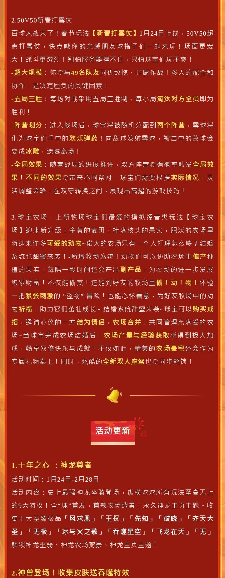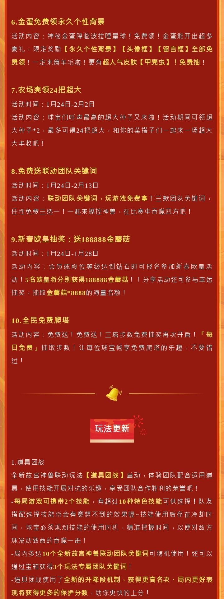 金蘑菇抽步数限时来袭!最高可抽中嘉年核心*999!希小哩在线许愿祝球宝们欧气满满,中大奖!还有全新技巧上新!「一键十六分」「直线四分中合」来袭就算是新手球宝也能轻轻松松玩上花式啦登录即可领取自选技巧包道具!助力球宝们猛猛上分!!!P.S. 关于决战波拉哩-个人阶段任务【嘉年核心】消耗数量显示错误的问题,我们正在修补数据处理中,给球宝们带来不便很抱歉,请大家耐心等待补偿哦~