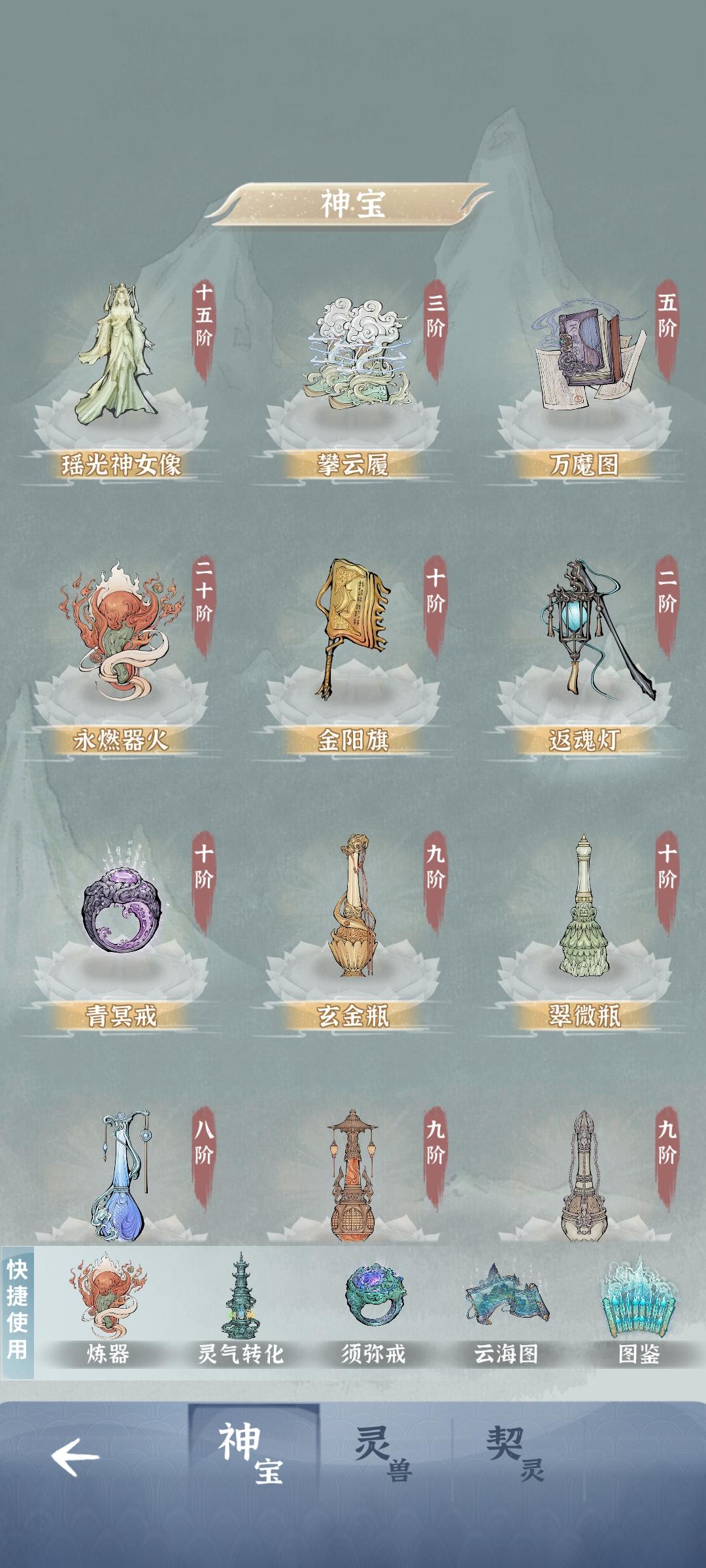 战斗方面: t0:青冥戒 t1:万魔图、金阳旗、燃魂瓶 t2:玄金瓶、翠微瓶、钓海瓶、岩龙瓶 t3:剑修灵台、枪修灵台、锤修灵台、气修灵台 游戏游玩方面: t0:须弥戒指一二三四五、引妖香炉、五行转灵塔 t1:攀云履 t2:返魂灯、青羊搜神灯
