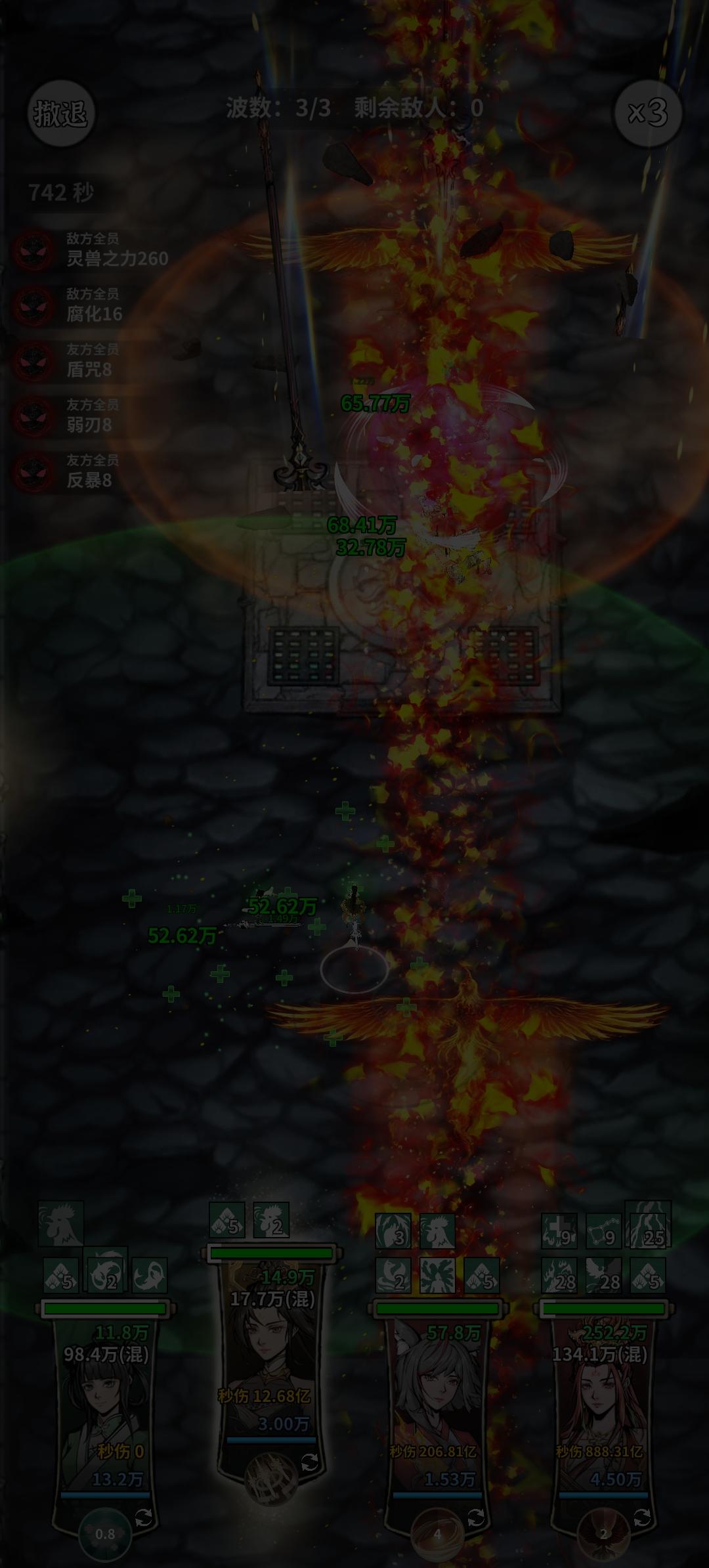 总结:实力+运气阵容站位:金锤+主角+木奶+辅助师尊第二波第三波手动走位如视频所示,最好让主角在一边,木奶和师尊在另一边补充:师尊作用:①法阵给主角独立增伤(破防不破盾强)②衣靠师尊控制改变怪物攻击方向增加木奶生存③宠物带鸡buff保持主角吃满加成宠物带潮湿加快打小怪龙女的进度④腾龙铃铛压血线,能争取几秒时间,装备很随意还没放铃铛⑤金芒术第三波控制boss,金锤安排有了,师尊还