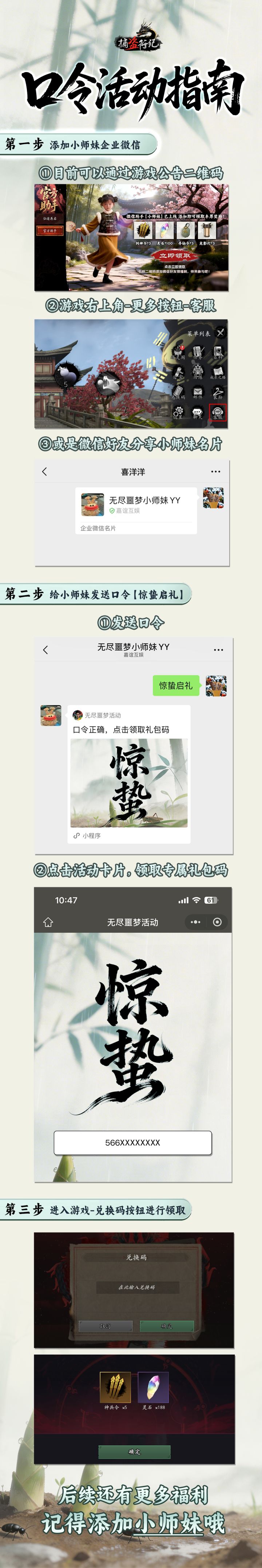 亲爱的小可爱们大家好呀!今日大年初一,万象更新!新的一年,江湖路远,但温暖常伴——记得按时吃饭、少熬夜,愿你的生活既有热血冒险,也有烟火可亲~在此为大家送上新年第二波福利福利码:WJEMXINNIAN福利内容:寻仙令*10+600灵石+玄铁石*30到期时间:2026年3月8日 23:59《无尽噩梦7幻梦》预约已开启:#中式恐怖 #捕盗行纪 #无尽噩梦 #无尽噩梦5怨灵咒 #无尽噩梦7
