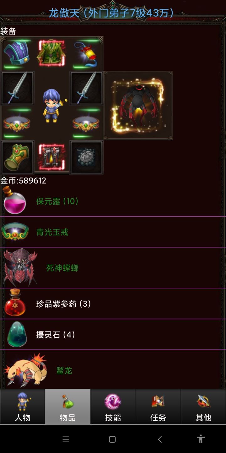勉强算是攻略吧记录一下自己的发展(因为是心血来潮所以之前都没有截图)刚开始按攻略走的纯物防(体质),技能加点长生诀+天灵武防+两仪剑法。建好号包里有8w多金钱,到右上武阳商人买白驹履+琉璃法链,其他装备买最基础的。到家族管家处接任务,收集8个蜂王腺,然后到左上角刷蜂王。刷完蜂王腺大概七八级的样子,稍稍更新一下装备,刷蘑菇灵刷到14级,去魔宠谷抓死神螂(嗑一个百年老参差不多就可以无伤打过)。
