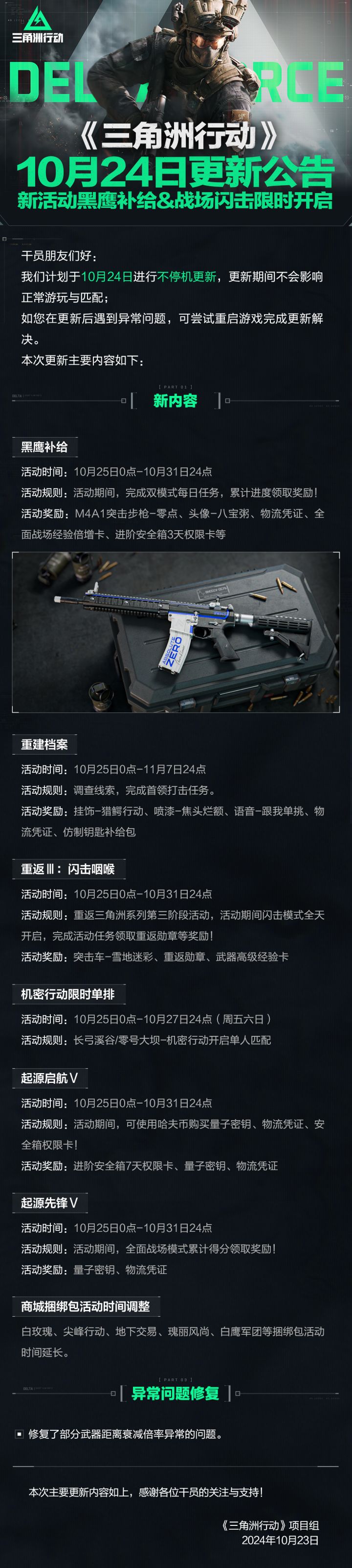 三角洲行动全新任务已下达,任务代号:Valley 据可靠线报,阿萨拉卫队和哈夫克公司武装仍在长弓溪谷地区交火,而溪谷内可能存在曼德尔砖的重要信息,这是一种由哈夫克科技研发的新型军事计算模块,请尽可能收集曼德尔砖样本并带出,我们确信这些样本具有极高的军事价值。 作为特战干员,你需由直升机投放进入区域,调查区域内各个势力,并尽可能收集各种物资。 ”无所畏惧,绝不言退。” 预祝行动顺利! ——G.T.I
