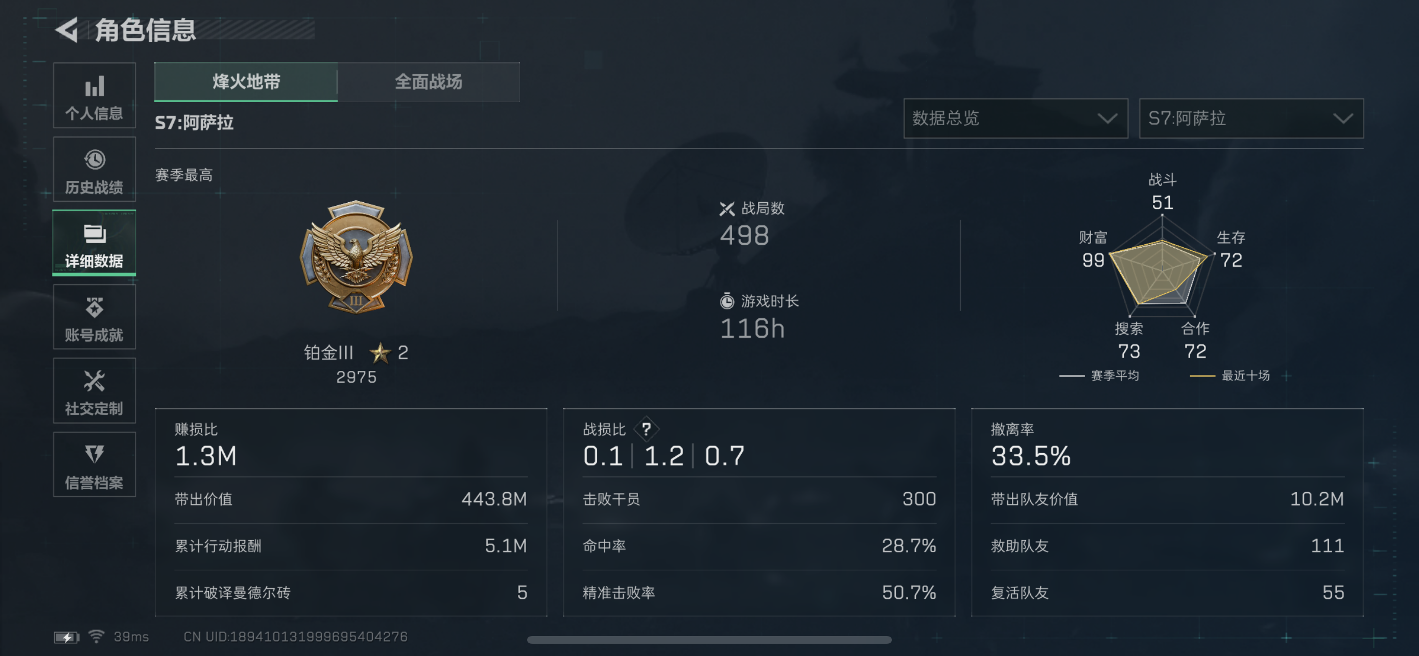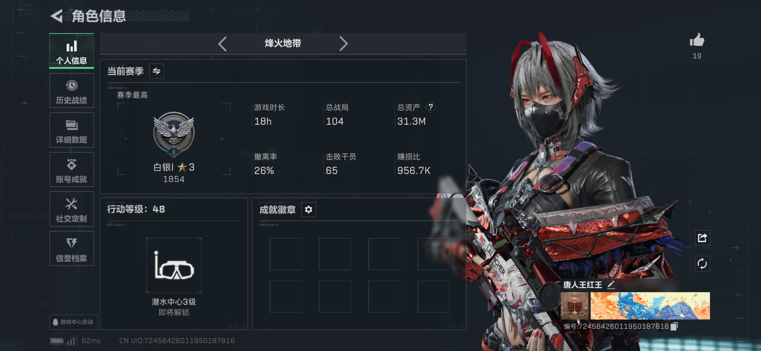 PC端,1等2,有没有人跟我一起玩,机密kd1.3,绝密kd0.8,游戏时间大概在17点到22点左右,几乎每天都有时间,爱打航天 ,不压力,打完一人一个包,最后撤离以前分一分钱