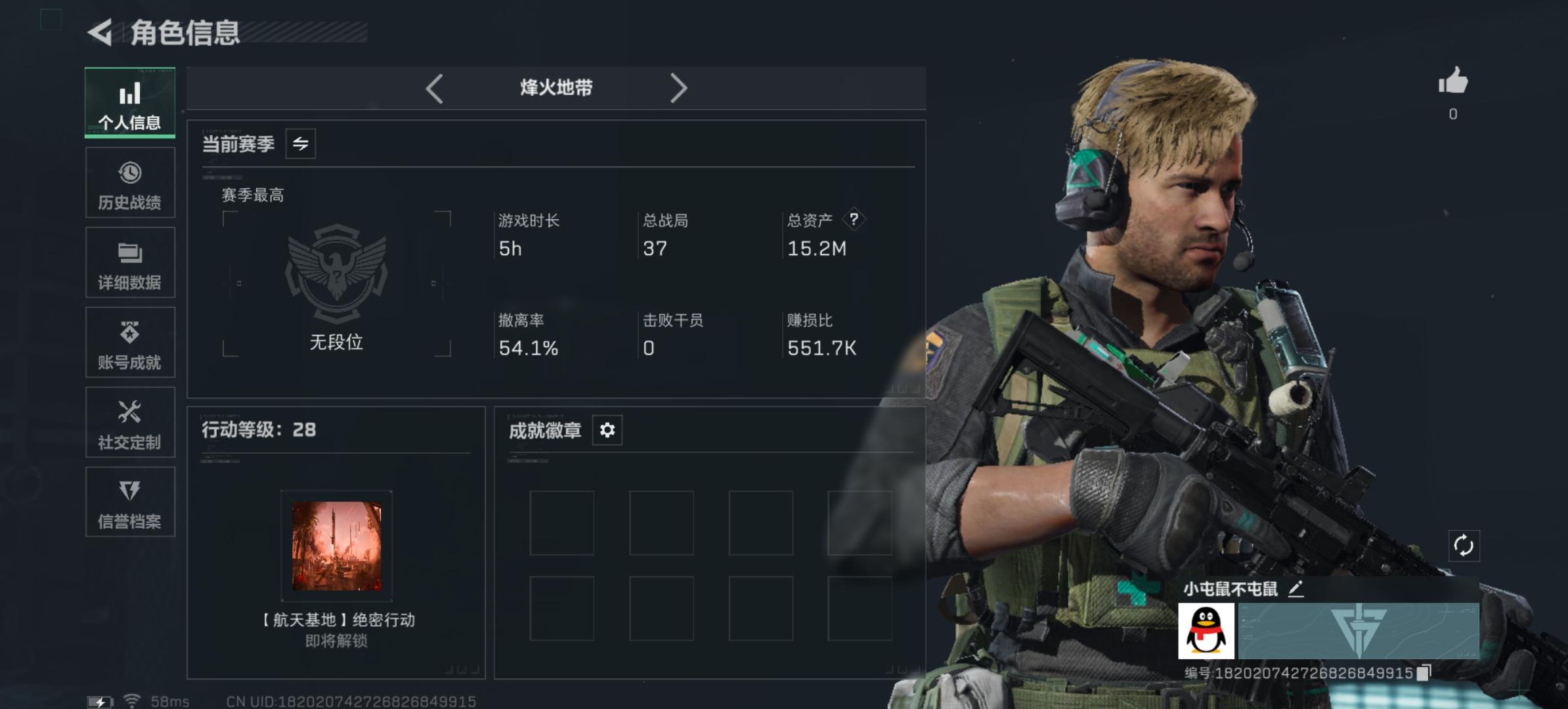 主打绝密航天,kd有点低,因为全是野排的,野排队友缺少配合,想找个有配合的固排,我可以玩突和信息 #三角洲行动 #三角洲征集行动