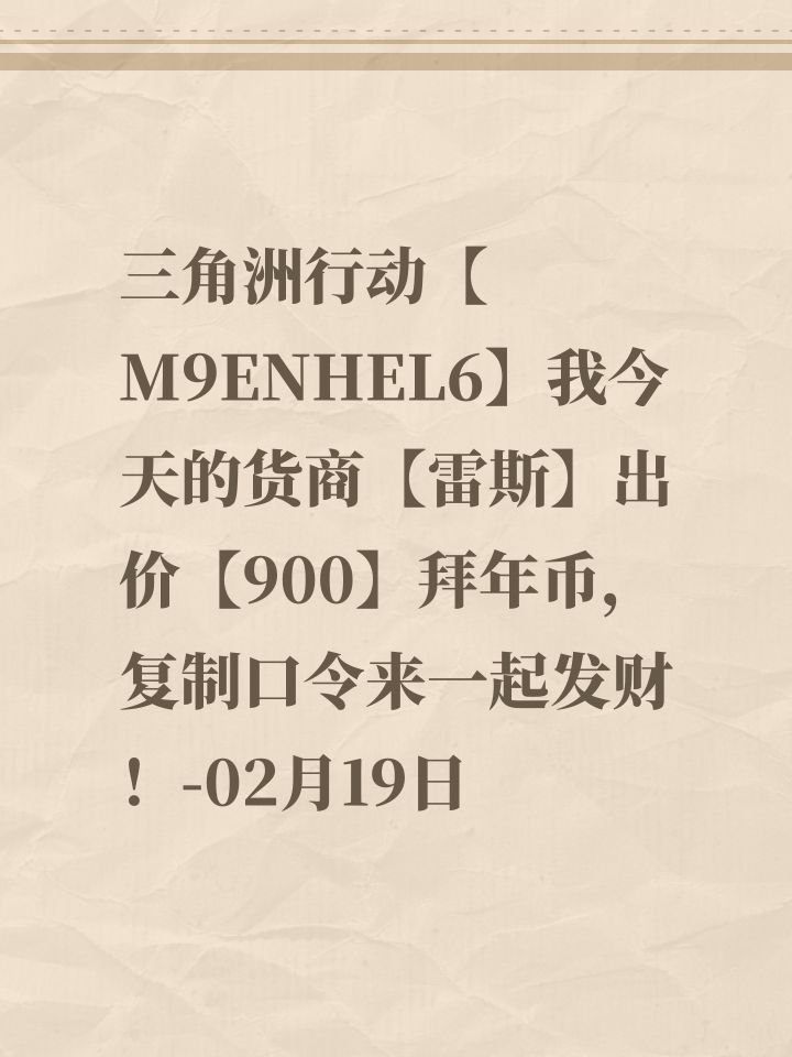 三角洲行动【M9ENHEL6】我今天的货商【雷斯】出价【900】拜年币,复制口令来一起发财!-02月19日