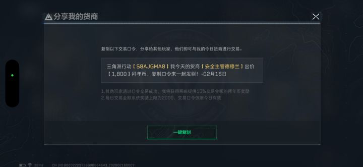 三角洲行动【4X0ICIZN】我今天的货商【雷斯】出价【1,600】拜年币,复制口令来一起发财!-02月16日