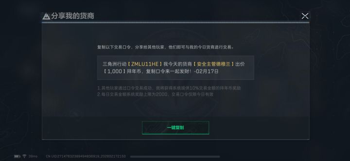 三角洲行动【RDCM54YX】我今天的货商【赛伊德】出价【1,100】拜年币,复制口令来一起发财!-02月17日