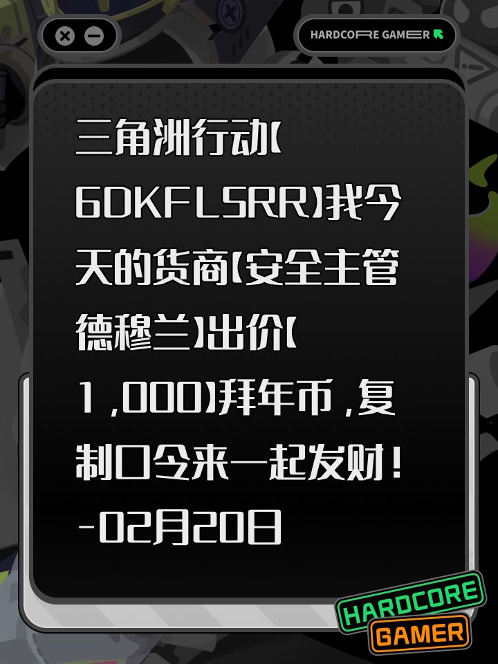 三角洲行动【M6JG1MCD】我今天的货商【安全主管德穆兰】出价【1,000】拜年币,复制口令来一起发财!-02月20日